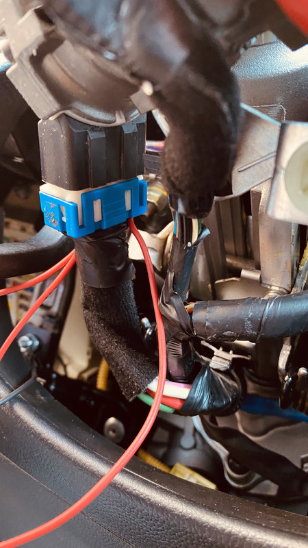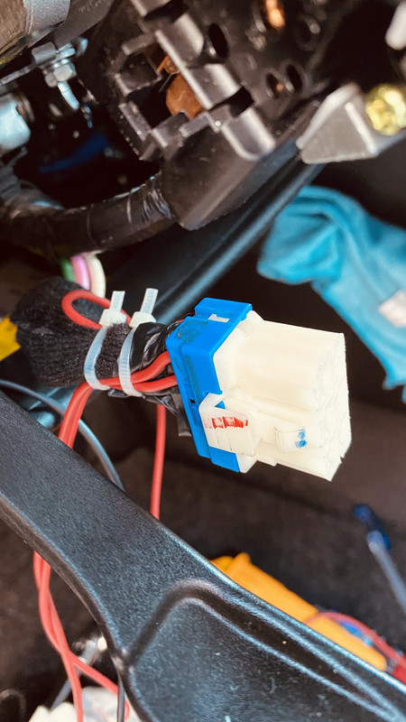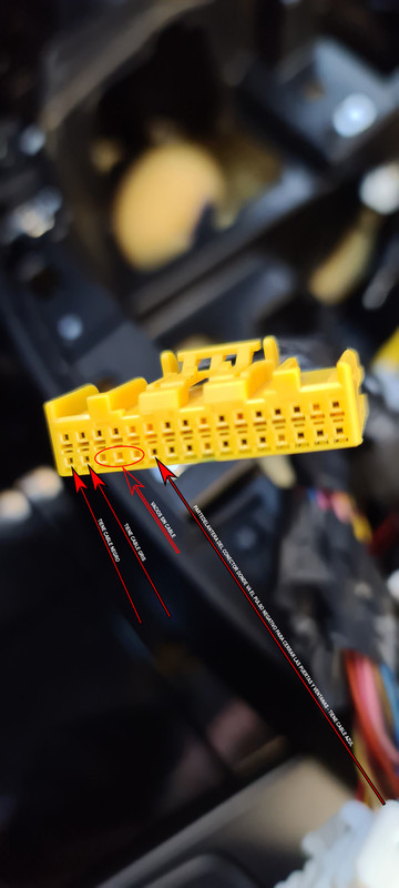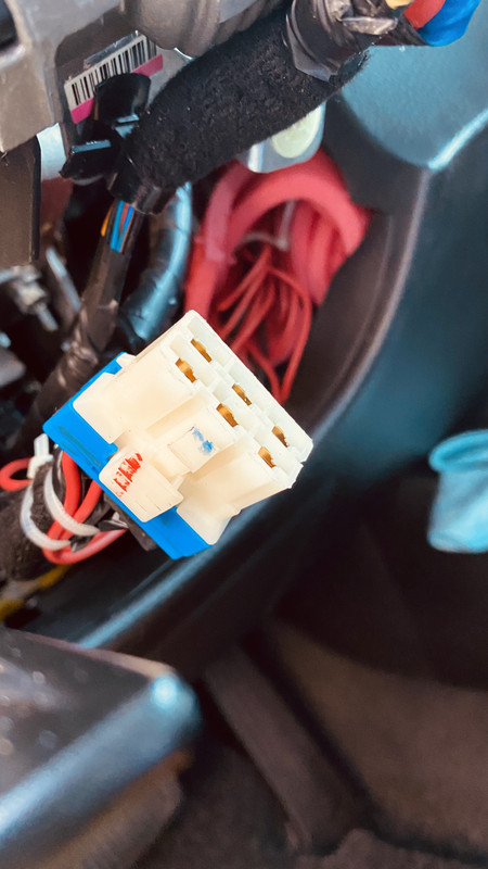 el conector es este, sobre el que vamos a hacer lo de parar el motor, una vez quitada la tapa esta en el lado izquierdo por donde esta la palanca de regular la posición del volante, en esta foto no esta terminado luego le puse bridas a los cables y cinta térmica, no corte nada solo soldar unos terminales en forma de punta el la punta de los cables y meterlos por la parte de abajo del terminal de 6 pines que tiene el coche con lo que no rompes nada y si un día quieres quitarlo lo quitas y como estaba todo sin nada cortado.